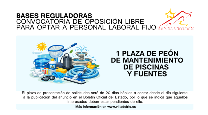 El área de Transparencia del Ayuntamiento de Villa del Río comunica que, habiéndose aprobado por Decreto de la Alcaldía nº 1854/2025, de 10 de noviembre de 2025, y nº 162/2026, de 2 de febrero de 2026, se hacen públicas las bases que regirán la convocatoria para cubrir un puesto correspondiente a la OEP 2025, de peón de mantenimiento de edificios e instalaciones municipales (piscinas y fuentes) como personal fijo, mediante sistema de concurso-oposición.