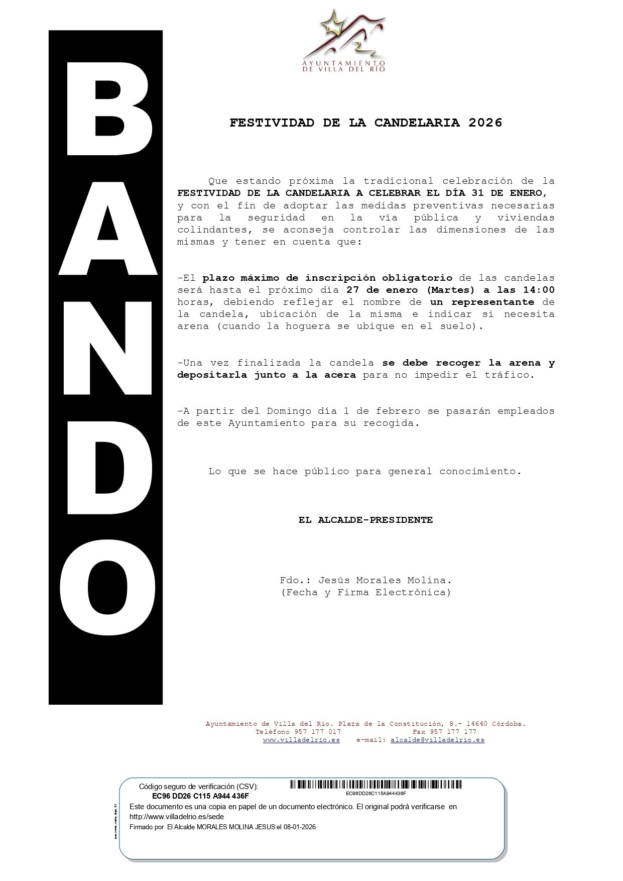 El Área de Festejos del Ayuntamiento de Villa del Río informa de la apertura del plazo para la inscripción obligatoria de las candelas en la próxima y tradicional *FESTIVIDAD DE LA CANDELARIA*, que se celebrará el