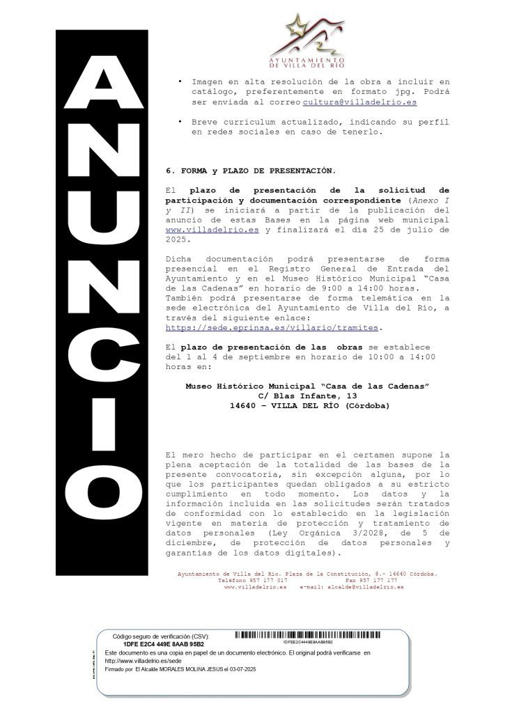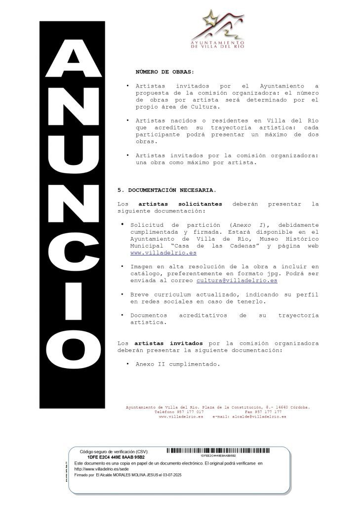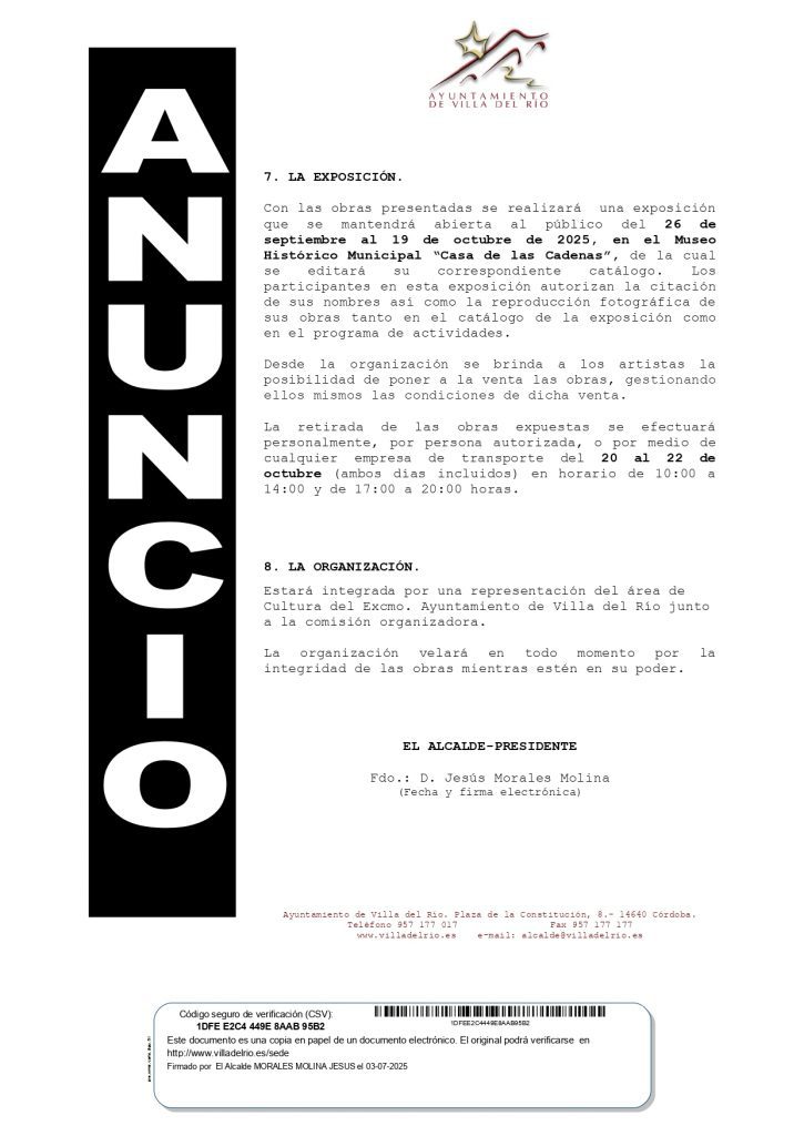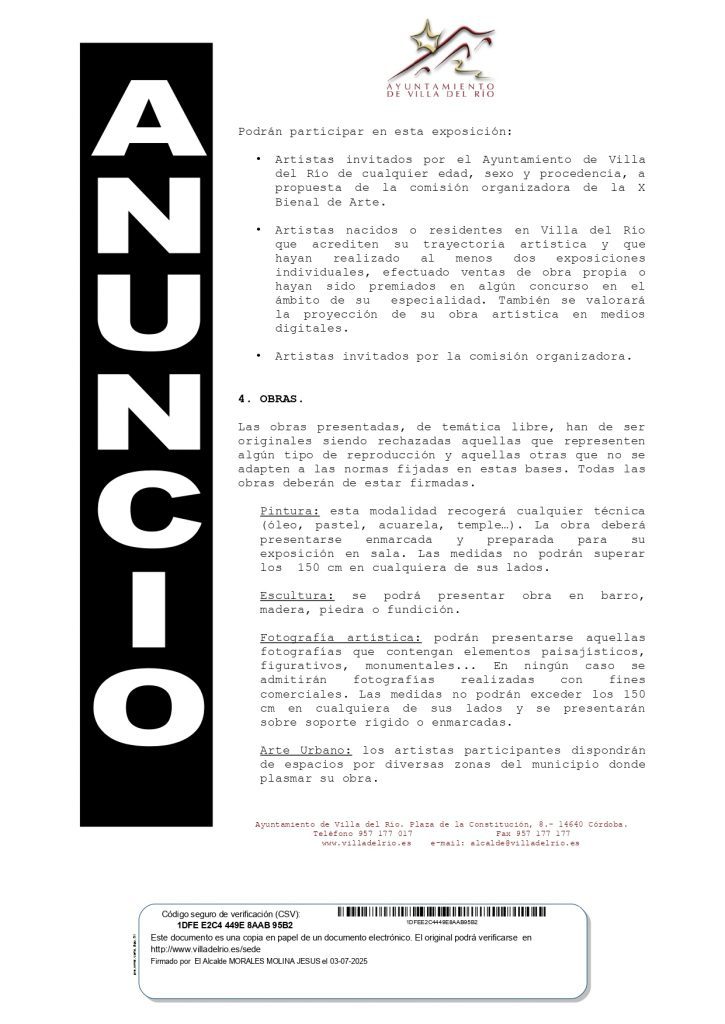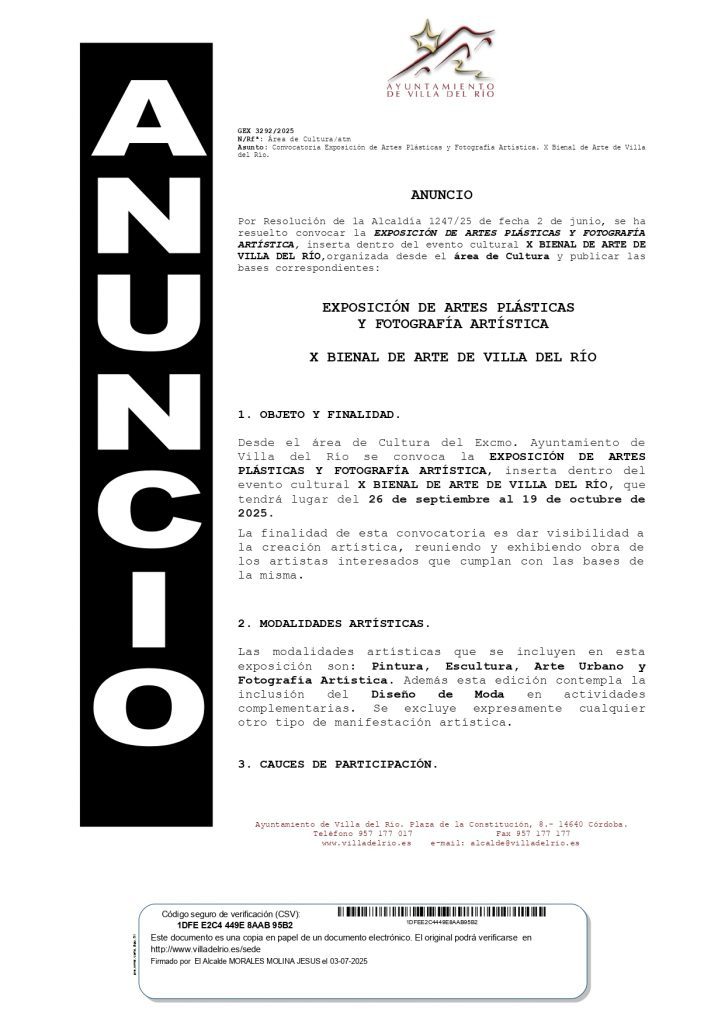 El área de Cultura del Ayuntamiento de Villa del Río comunica que, por Resolución de la Alcaldía 1247/25 de fecha de 2 de junio de 2025, se ha resuelto convocar la Exposición de Artes Plásticas y Fotografía Artística, inserta dentro del evento cultural X BIENAL DE ARTE DE VILLA DEL RÍO, organizada desde el área, y publicar las bases correspondientes.