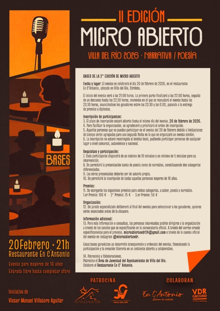 El área de Juventud del Ayuntamiento de Villa del Río publica las bases de la II Edición de “Micro Abierto”, un encuentro cultural y concurso literario dirigido a personas mayores de 16 años, donde podrán mostrar su creatividad en las modalidades de narrativa y poesía.