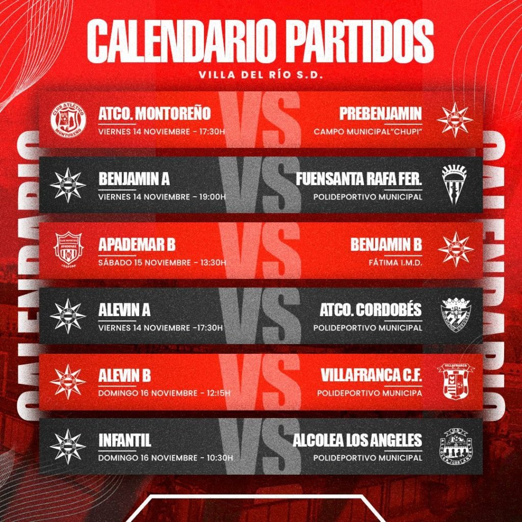 El Servicio Municipal de Deportes del Ayuntamiento de Villa del Río presenta el calendario de encuentros que disputarán los equipos del Villa del Río S.D. durante los próximos días.