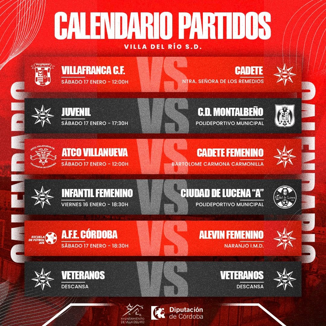 ↪️ El Servicio Municipal de Deportes del Ayuntamiento de Villa del Río informa que los equipos del Villa del Río S.D. afrontan un nuevo fin de semana de competición con encuentros dentro y fuera del municipio, abarcando todas las categorías de fútbol base y fútbol femenino.