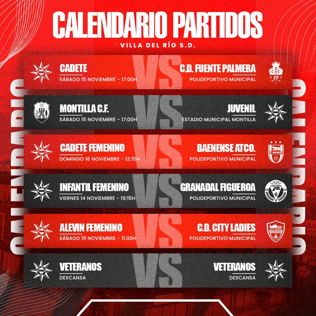 El Servicio Municipal de Deportes del Ayuntamiento de Villa del Río presenta el calendario de encuentros que disputarán los equipos del Villa del Río S.D. durante los próximos días.