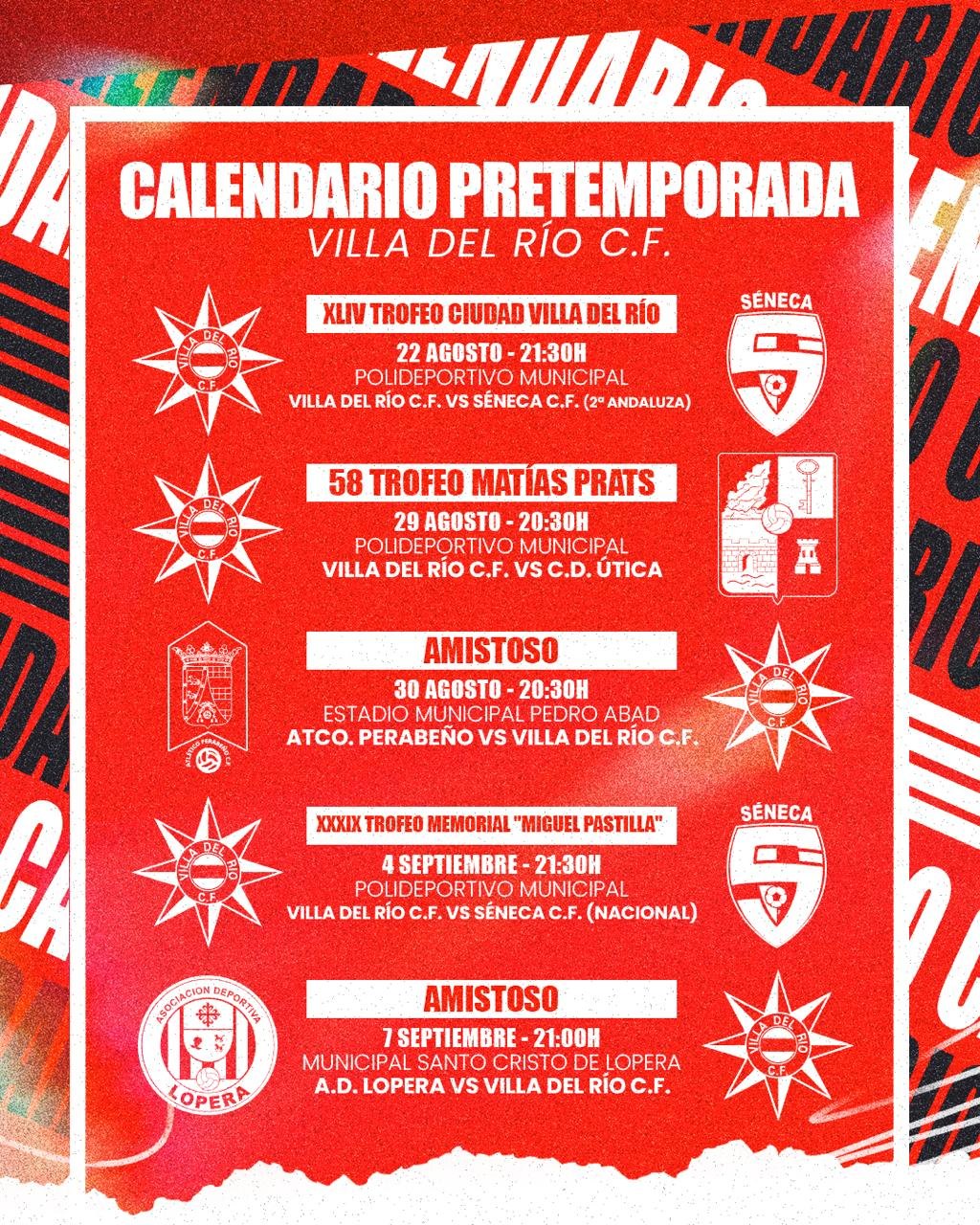 ↪️ El área de Deportes del Ayuntamiento de Villa del Río comunica que el Villa del Río CF ya tiene definido su calendario de pretemporada, con diferentes encuentros amistosos y tradicionales trofeos veraniegos que se disputarán en nuestro municipio y en localidades vecinas.
