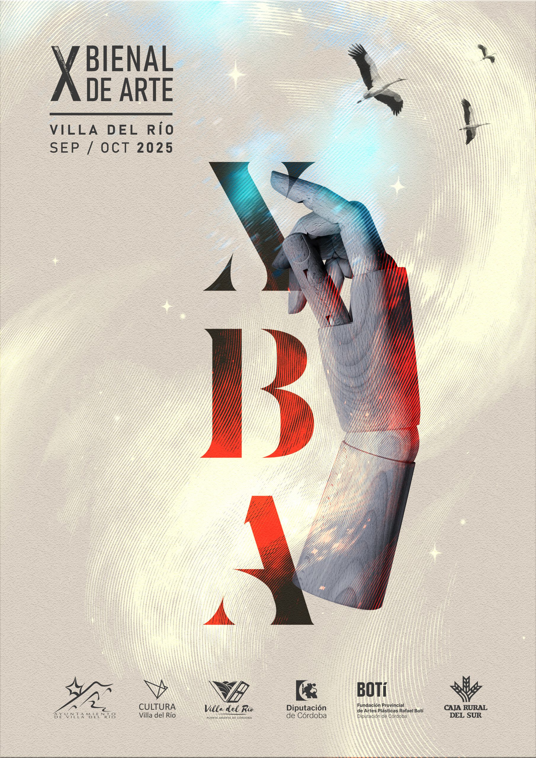 “XBA es, como también VDR, un acrónimo con identidad. Las tres letras que lo componen, junto a esta mano articulada, ejercen de eje visual para esta composición que será la imagen de la X Bienal de Arte de Villa del Río. En la mano he querido expresar el reflejo del artista en su contexto y en sus herramientas, como también reflejar el diálogo tan trepidante que en esta era digital vivimos en torno a este tema. En torno al baile de ambos elementos que hacen de núcleo, se mueven texturas evocadoras y un contraste entre la suavidad de una gama más pastel y tres colores que ejercen de luz. Colores que se enfrentan y a la vez se abrazan. Cigüeñas, una por cada letra, que nos hacen mirar a nuestro cielo y pensar como pueblo. Y por último, manteniendo el equilibrio y ejerciendo el importante papel de comunicar, la tipografía que he moldeado para el nombre de nuestro evento. El proceso sigue vivo y continúa, este cartel es solo uno de sus latidos.”