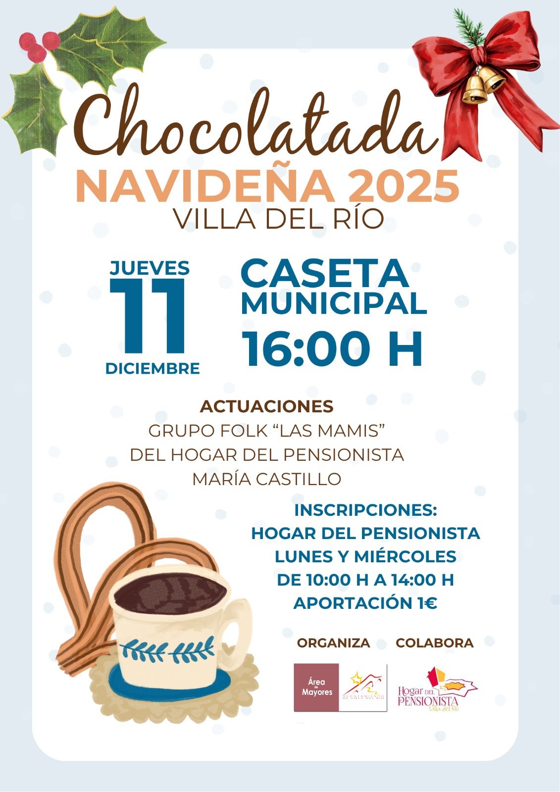 El área de Mayores del Ayuntamiento de Villa del Río organiza, en colaboración del Hogar del Pensionista, la tradicional «CHOCOLATADA NAVIDEÑA» para mayores de 65 años, el jueves 11 de diciembre de 2025 a las 16:00 h en la Caseta Municipal.