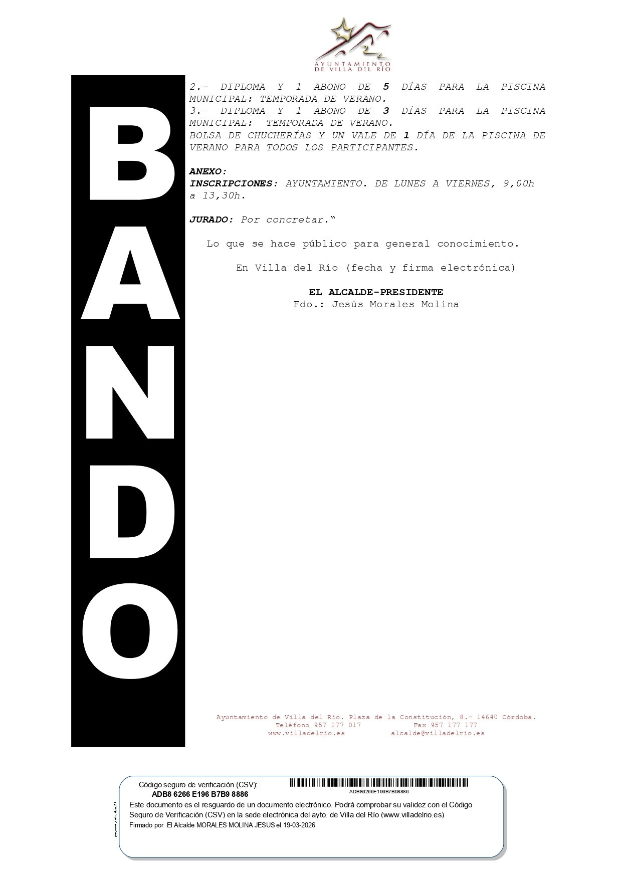 El área de Festejos del Ayuntamiento de Villa del Río convoca el concurso de CRUCES DE MAYO 2026, en las categorías de adultos e infantil, conforme a las bases aprobadas por Resolución de Alcaldía nº 383/2026, de fecha 18 de marzo de 2026.
