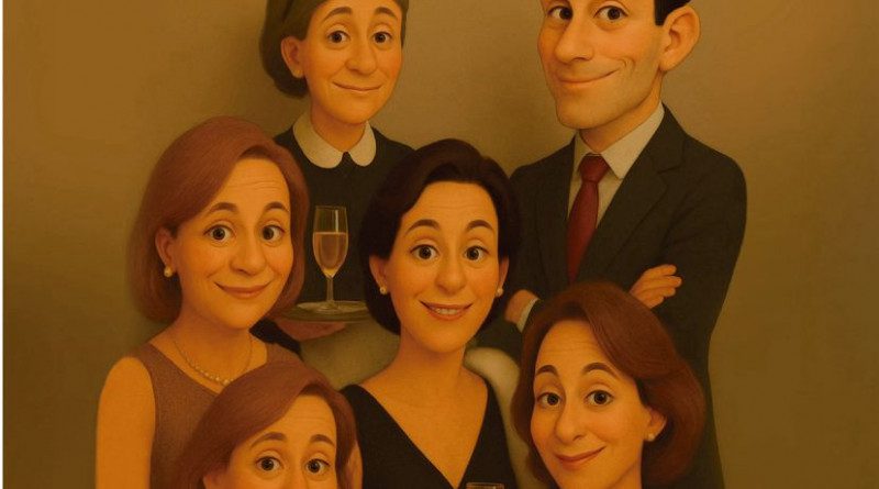 Ambientada en lo que parece ser una clásica escena de los años 50 o 60, cinco personajes —cuatro mujeres y un hombre— nos invitan a adentrarnos en una historia elegante y cómica. Entre ellos, una mujer con uniforme de criada, un caballero con traje y corbata, y tres mujeres con copas de vino y champán. Todos con un aire familiar, como si fueran parte de una misma y excéntrica familia.