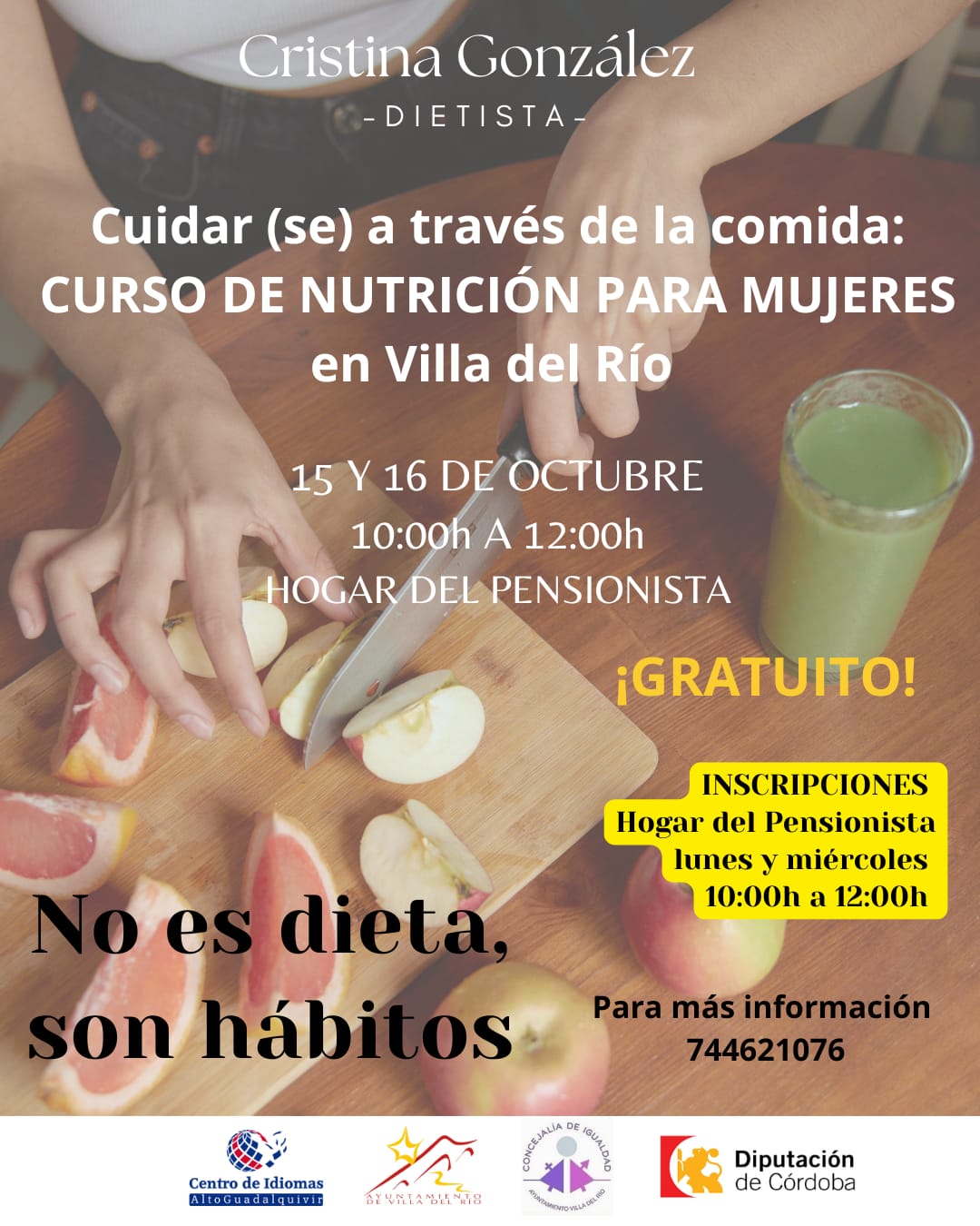 El área de Igualdad del Ayuntamiento de Villa del Río informa que los próximos 15 y 16 de octubre de 2025, en horario de 10:00 a 12:00 horas, se celebrará en el Hogar del Pensionista el curso “Cuidar(se) a través de la comida: Curso de Nutrición para Mujeres”, impartido por la dietista Cristina González.