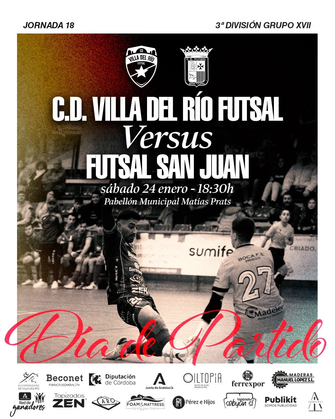 El área de Deportes del Ayuntamiento de Villa del Río informa que este sábado, 24 de enero, el C.D. Villa del Río Futsal disputará un nuevo encuentro correspondiente a la Jornada 18 de la 3.ª División – Grupo XVII, en esta ocasión como local.
