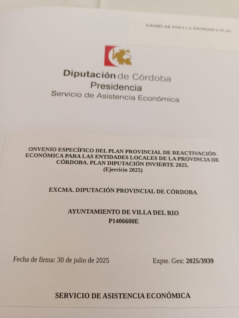El alcalde de Villa del Río, D. Jesús Morales Molina, firmó en el día de ayer, 30 de julio de 2025, el convenio del Plan «Diputación Invierte 2025», un programa de reactivación económica dirigido a entidades locales, con el que el Ayuntamiento de Villa del Río recibirá de la institución provincial una subvención económica que alcanza los 198.400,56 euros para la ejecución de diferentes proyectos en la localidad.