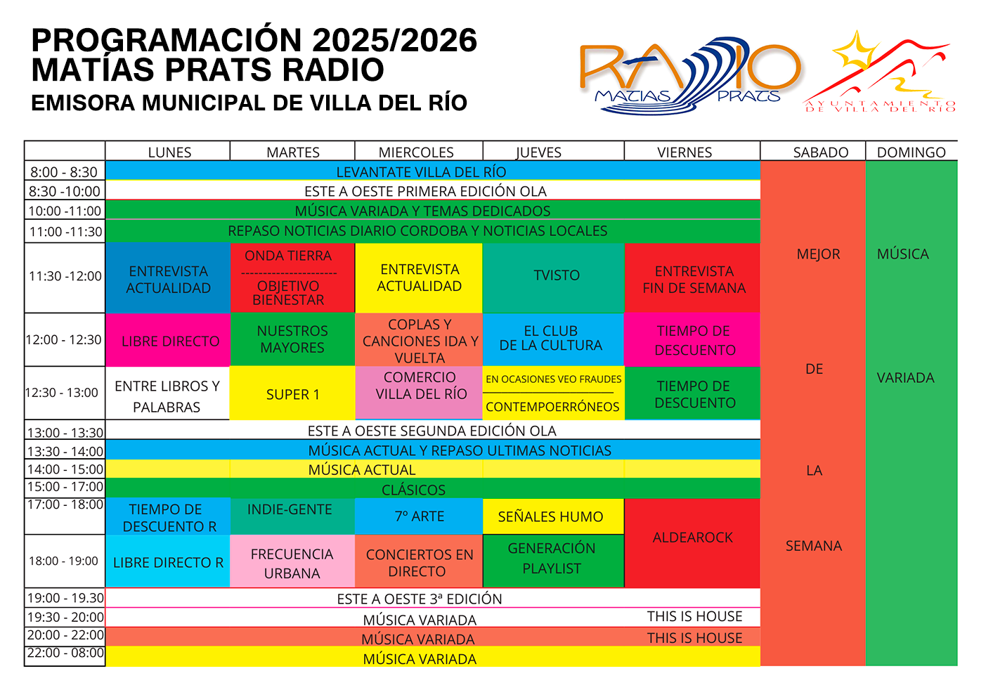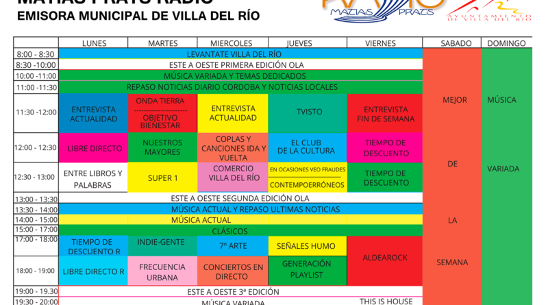 El área de Nuevas Tecnologías del Ayuntamiento de Villa del Río comunica que durante la celebración del Consejo de Administración de la Emisora Municipal «Matías Prats Radio» realizado el martes, 2 de diciembre de 2025 tuvo lugar la aprobación de la nueva programación de la entidad.