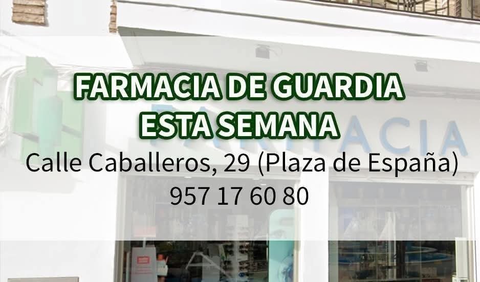 ActualidadÚltimas Noticias FARMACIA DE GUARDIA ESTA SEMANA EN VILLA DEL RÍO 27/04/2026 VILLADELRIODIGITAL Del lunes, 27 de abril al domingo, 3 de mayoFarmacia Lcda. Carmen Monasterio SánchezCalle Caballeros, 29 (Plaza de España)957 17 60 80
