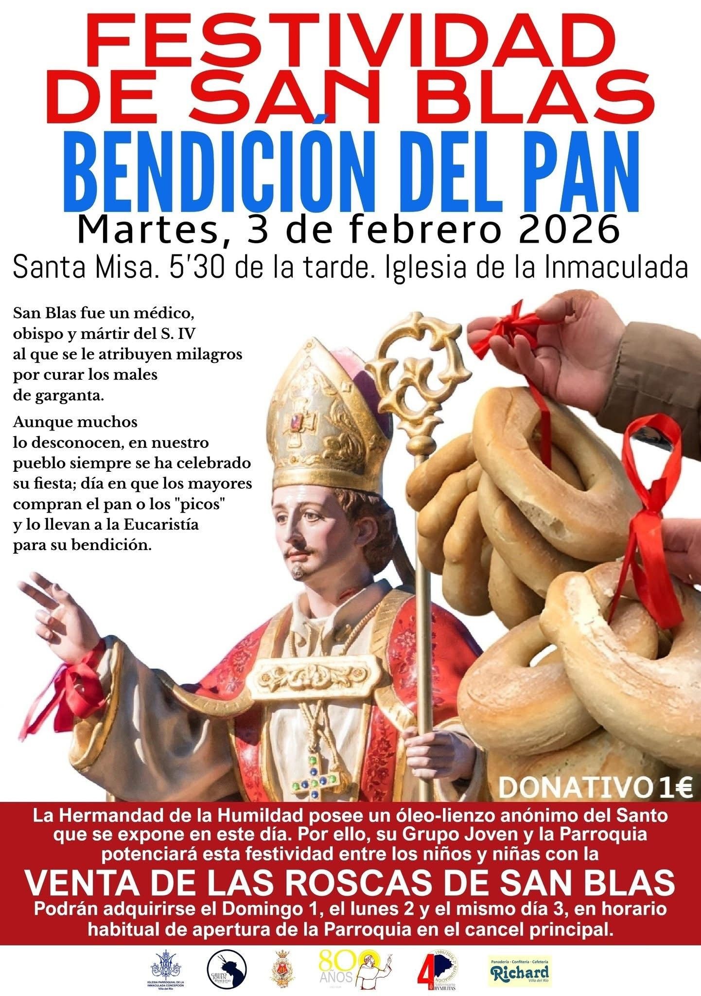 El área de Cultura del Ayuntamiento de Villa del Río informa de la celebración de la Festividad de San Blas, evento organizado por la Iglesia Parroquia de la Inmaculada Concepción, junto a la Franciscana Hermandad de la Humildad contando con la colaboración de la Panadería Richard.