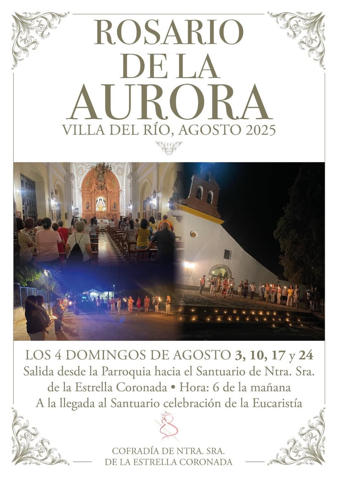 El área de Cultura del Ayuntamiento de Villa del Río informa que, un año más, la Cofradía de Nuestra Señora de la Estrella Coronada organiza el Rosario de la Aurora, una cita cargada de devoción, fe y tradición que se celebrará los cuatro domingos del mes de agosto: días 3, 10, 17 y 24, a las 6:00 h de la mañana.