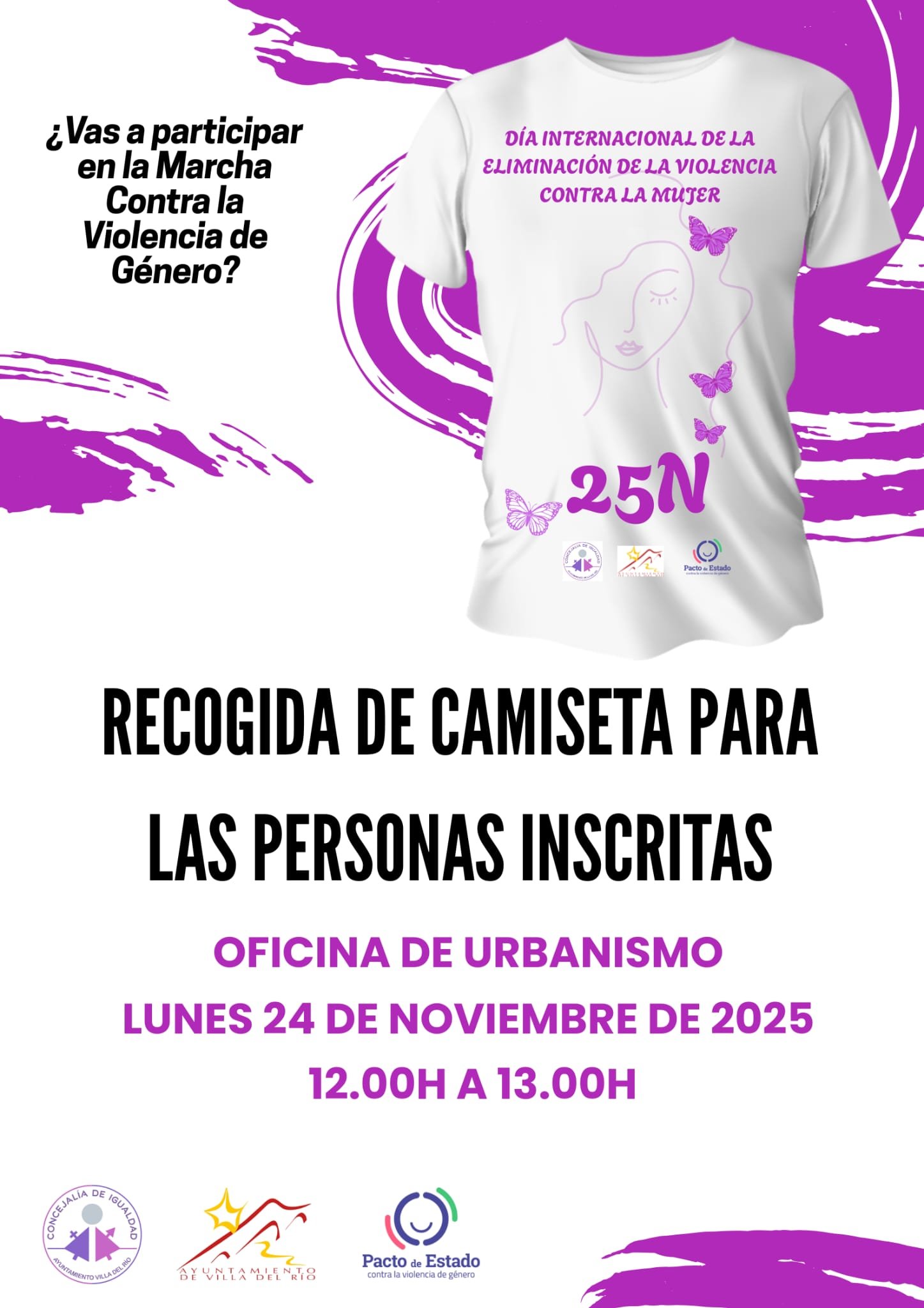 El área de Igualdad del Ayuntamiento de Villa del Río comunica que la entrega de camisetas para las personas inscritas en la marcha del 25N se realizará en la Oficina de Urbanismo (junto a Jefatura de Policía Local) el lunes, 24 de noviembre de 2025, en horario de 12:00 h a 13:00 h.