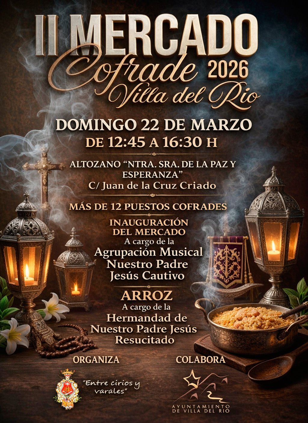 El área de Cultura del Ayuntamiento de Villa del Río informa de la celebración del II Mercado Cofrade de Villa del Río, una jornada dedicada al ambiente y las tradiciones de la Semana Santa que reunirá a cofradías, visitantes y vecinos en torno a la cultura cofrade. El evento está organizado por la Taberna Cofrade “Entre Cirios y Varales” y la Franciscana Hermandad y Cofradía de Nazarenos del Stmo. Cristo de la Humildad en su Presentación al Pueblo y San Bartolomé Apóstol, contando con la colaboración del consistorio.