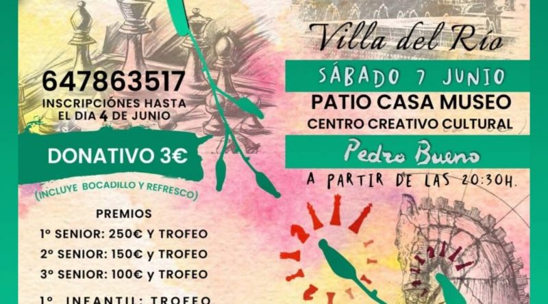 El área de Deportes del Ayuntamiento de Villa del Río organiza el XXIX MEMORIAL DE AJEDREZ ‘JOSÉ ANTONIO TOLEDANO’, con el patrocinio de la Diputación de Córdoba.