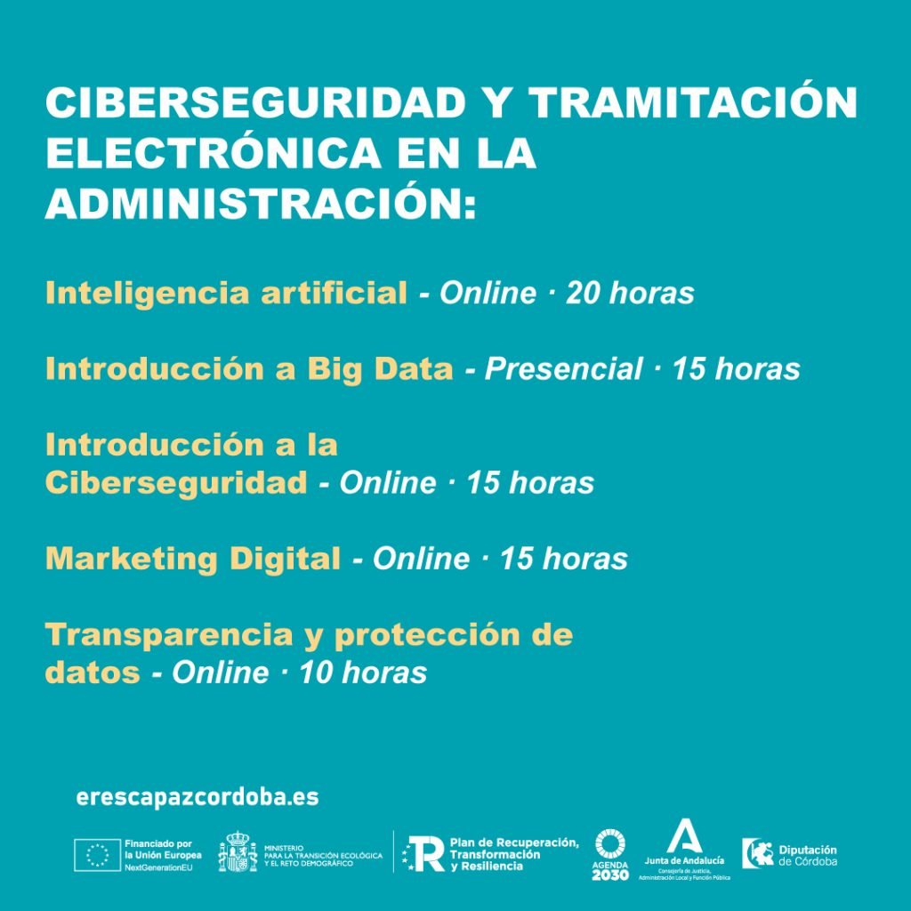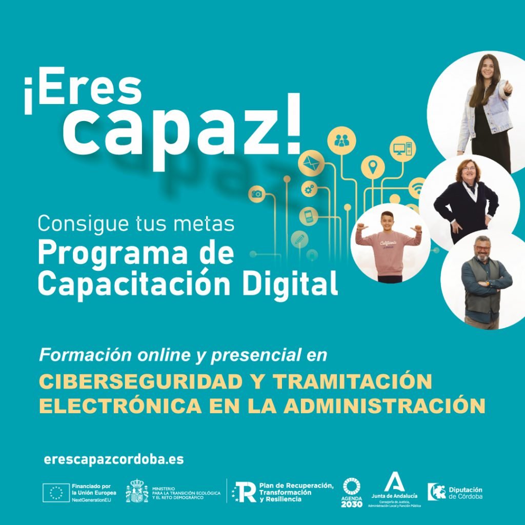 El área de Nuevas Tecnologías del Ayuntamiento de Villa del Río informa de la apertura de nuevas acciones formativas dentro del Programa “Eres Capaz”, impulsado por la Diputación de Córdoba, dirigidas a mejorar las competencias digitales de la ciudadanía. Se trata de un proyecto financiado por la Unión Europea – Next Generation y el Plan de Recuperación del Ministerio para la Transición Ecológica y el Reto Demográfico.
