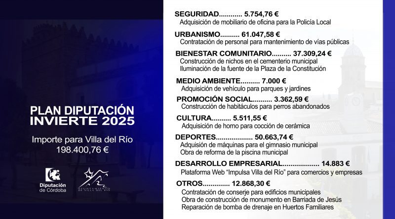 EL AYUNTAMIENTO DE VILLA DEL RÍO DESTINARÁ 198.400,56 € DEL PLAN “DIPUTACIÓN INVIERTE 2025” PARA NUEVOS PROYECTOS MUNICIPALES