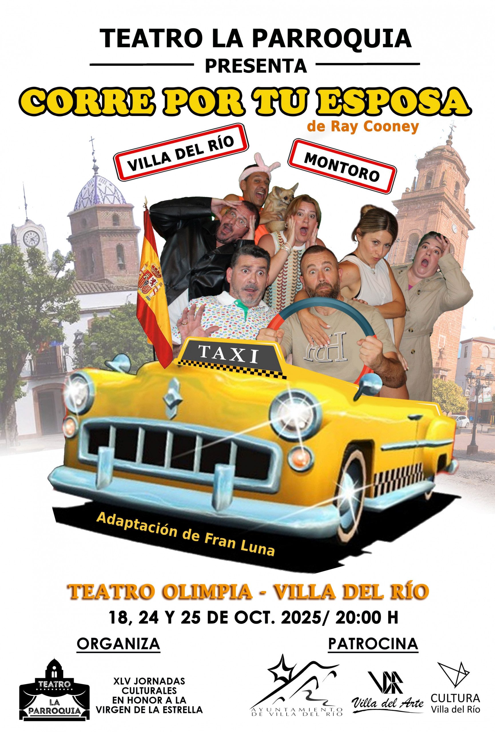 El área de Cultura del Ayuntamiento de Villa del Río patrocina las XLV JORNADAS CULTURALES-TEATRALES en honor a la Virgen de la Estrella Coronada. Organizadas por el Grupo de Teatro «La Parroquia», quienes representarán sobre las tablas del Teatro Municipal Olimpia la obra. La obra para mayores de 12 años, «Corre por tu esposa», del dramaturgo británico Ray Cooney, ha sido adaptada por Francisco Javier Luna Mantas.