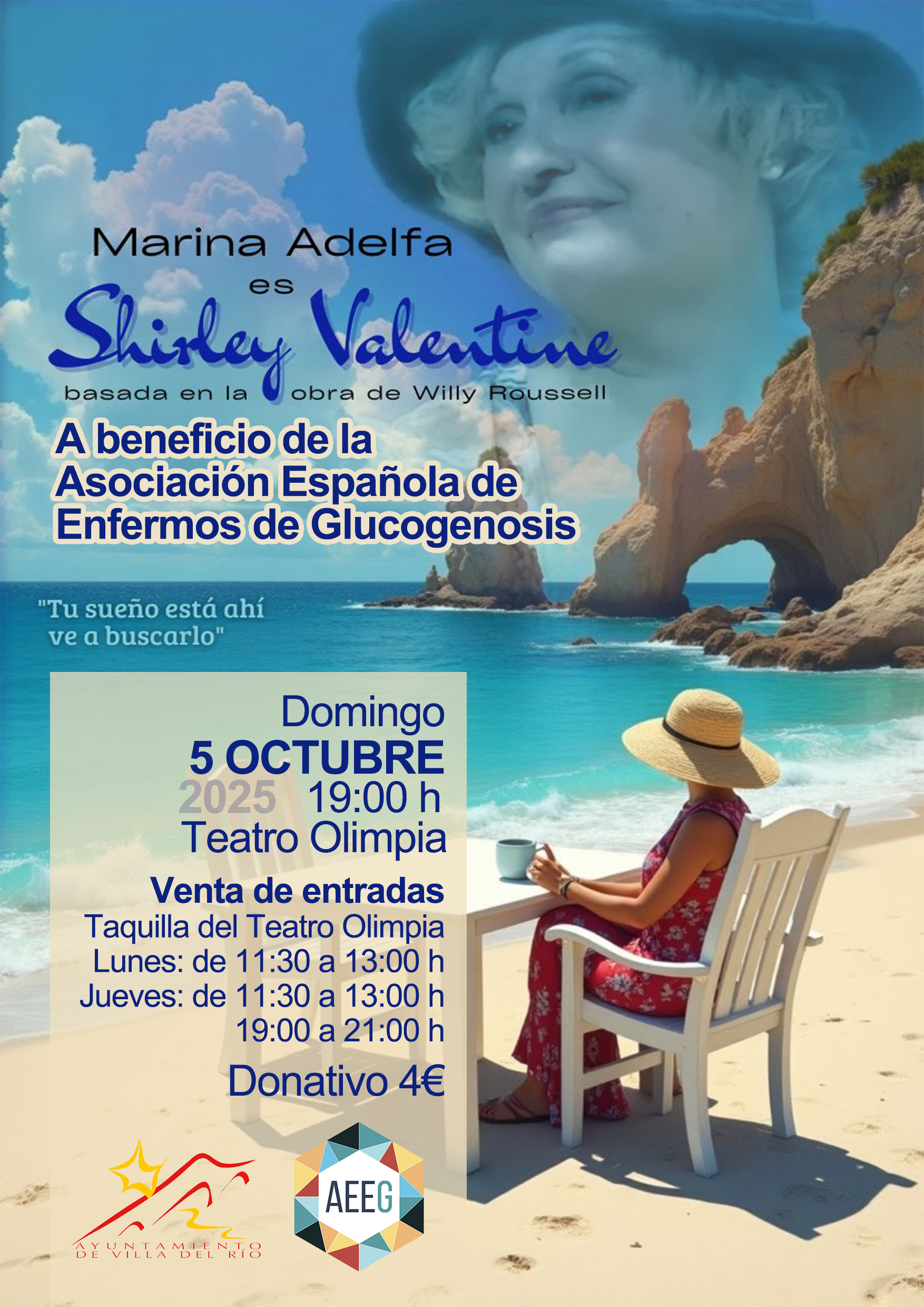 Las áreas de Cultura y Servicios Sociales del Ayuntamiento de Villa del Río comunican que nuestro Teatro Municipal Olimpia acogerá la representación teatral de «Shirley Valentine», basada en la obra de Willy Roussell, a cargo de la villarrense Marina Adelfa.