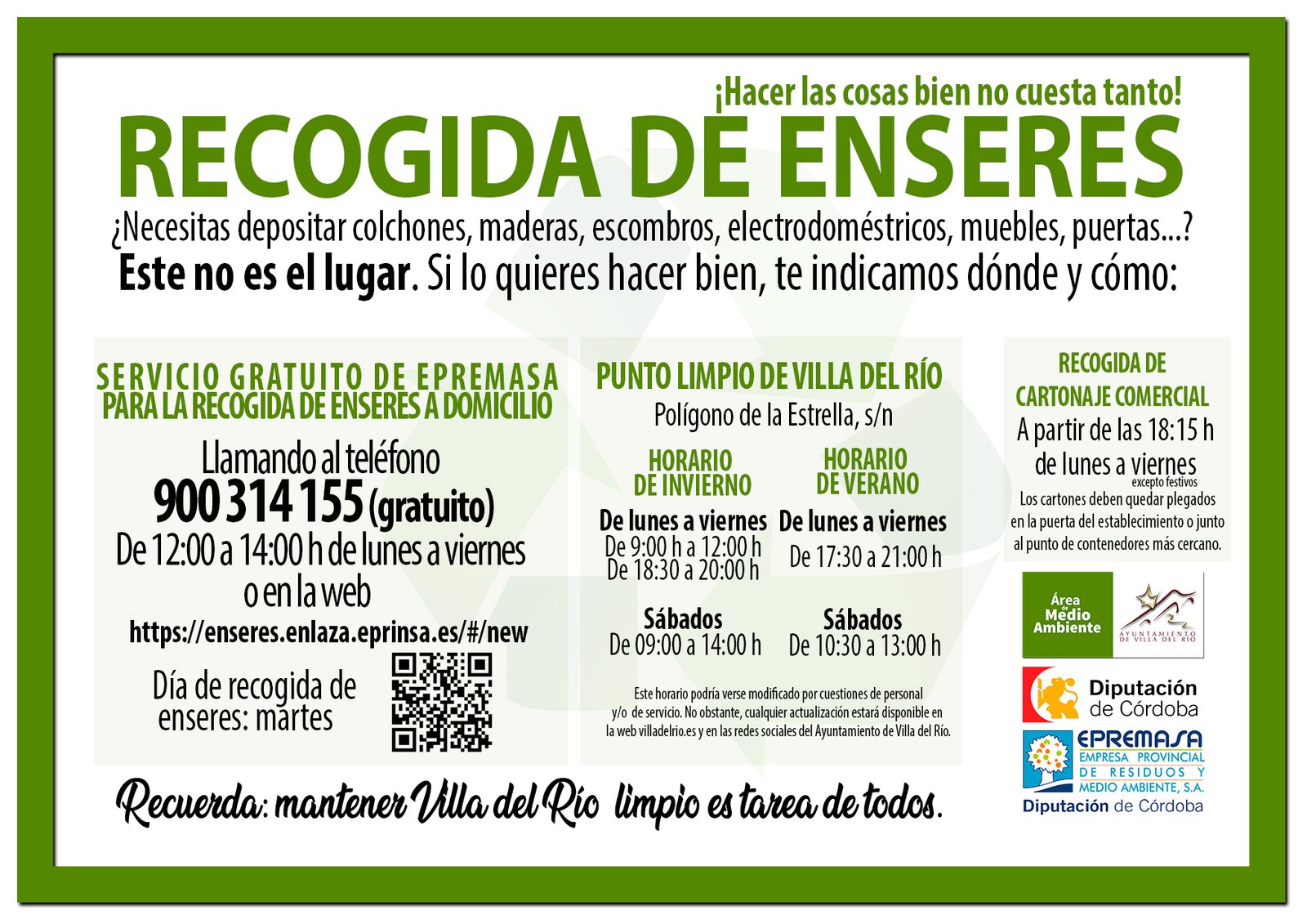 El área de Medio Ambiente del Ayuntamiento de Villa del Río recuerda el procedimiento para la recogida de enseres en caso de necesitar depositar colchones, maderas, escombros, electrodomésticos, muebles, puertas… Para ello, los contenedores no son el lugar adecuado sino que hay varias alternativas: