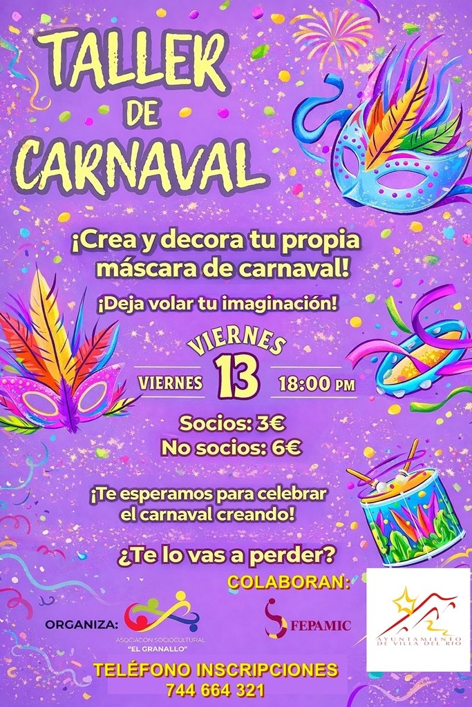 ↪️ El área de Educación del Ayuntamiento de Villa del Río informa que el próximo viernes 13 de febrero se celebrará un Taller de Carnaval organizado por la Asociación Sociocultural El Granaíllo, una propuesta creativa pensada para disfrutar del carnaval a través de la imaginación, las manualidades y la convivencia.