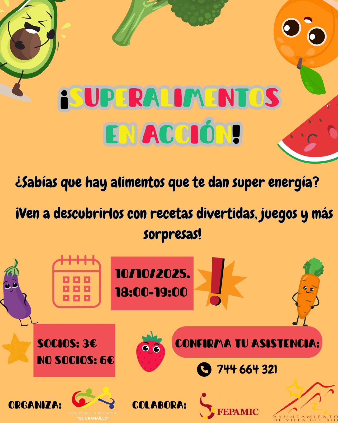 ↪️ El área de Educación del Ayuntamiento de Villa del Río informa que el próximo viernes, 10 de octubre de 2025, tendrá lugar la divertida actividad “¡Superalimentos en acción!”, organizada por la Asociación Centro Especial “El Granaillo”, en colaboración con FEPAMIC y el propio Ayuntamiento.