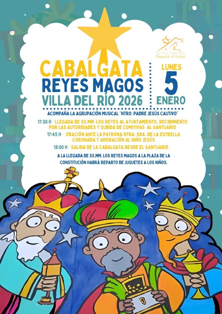 El área de Festejos del Ayuntamiento de Villa del Río organiza la Cabalgata de Reyes Magos 2026 junto a las Hermandades de la Humildad, La Soledad, San Juan y la Magdalena, el acompañamiento musical de la Agrupación Musical “Ntro. Padre Jesús Cautivo” y la colaboración de la Agrupación Local de Voluntarios de Protección Civil y Policía Local.
