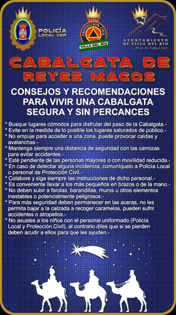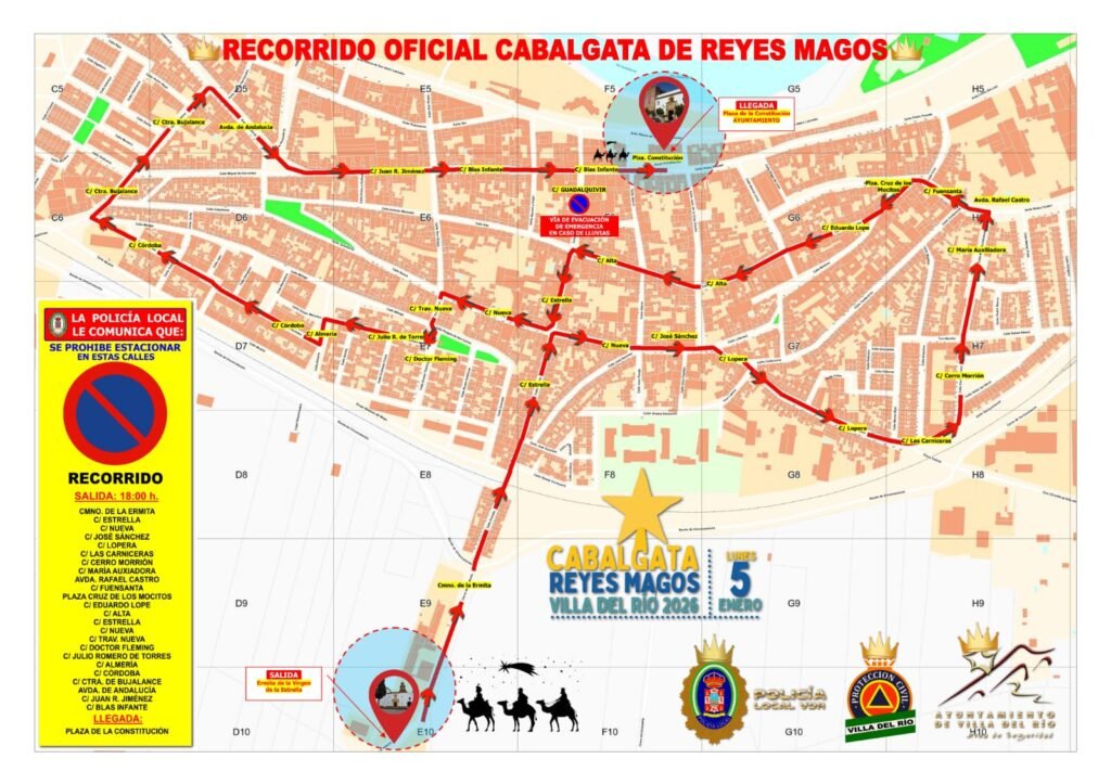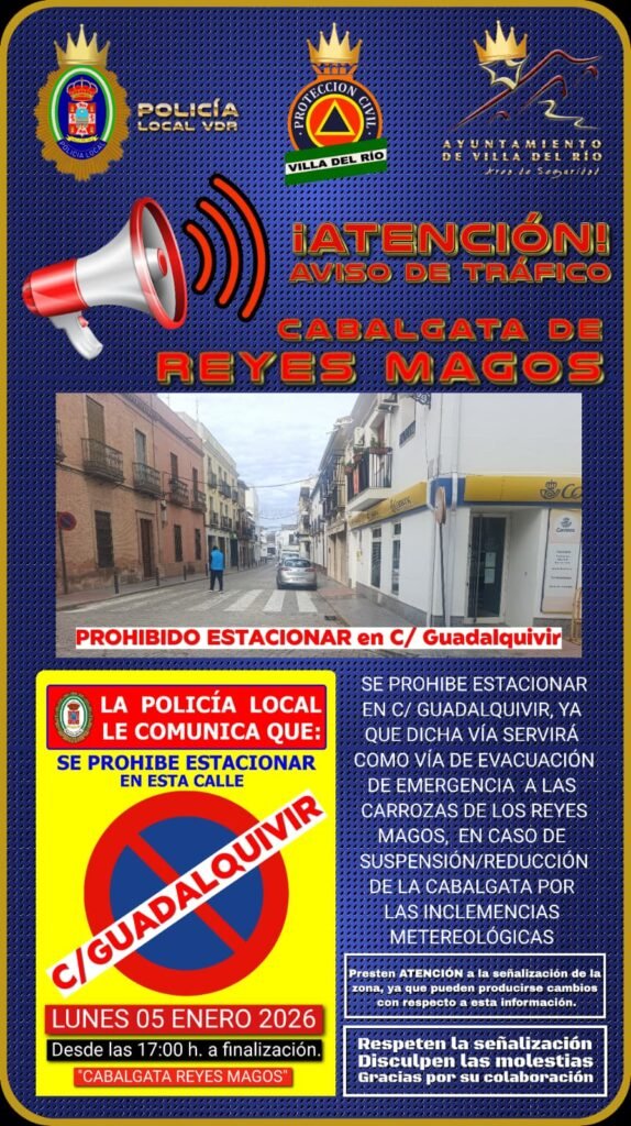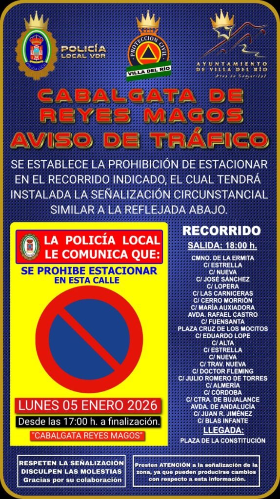 Asimismo, el área de Seguridad del Ayuntamiento de Villa del Río comunica que la Policía Local informa que está prohibido estacionar en las citadas calles, plazas, carreteras y avenidas durante el transcurso de la cabalgata. Se informa de que la calle Guadalquivir quedará totalmente libre de estacionamiento, ya que podrá ser utilizada como vía de evacuación y emergencia para las carrozas de los Reyes Magos, especialmente en caso de suspensión o modificación del recorrido por inclemencias meteorológicas.