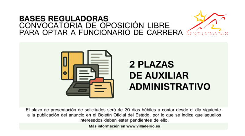 El área de Transparencia del Ayuntamiento de Villa del Río comunica que habiéndose aprobado por Resolución de Alcaldía número 1837/2025, con fecha 6 de noviembre de 2025, se hacen públicas las bases que regirán la convocatoria para cubrir dos puestos correspondientes a la OEP 2025, de auxiliar administrativo mediante sistema de oposición.