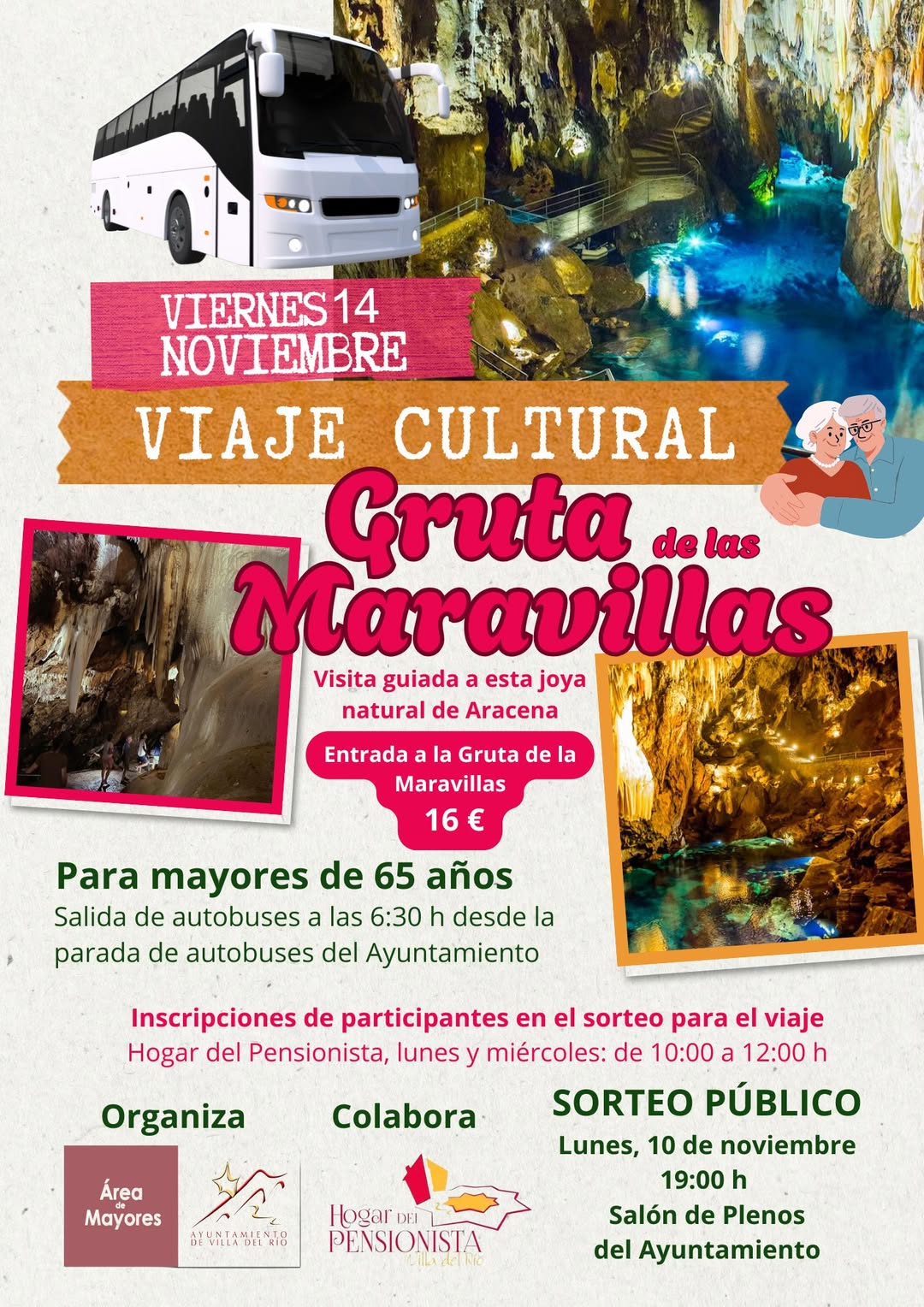 El área de Mayores del Ayuntamiento de Villa del Río organiza, en colaboración con el Hogar del Pensionista, un viaje cultural a la Gruta de las Maravillas, con visita guiada a esta joya natural de Aracena.