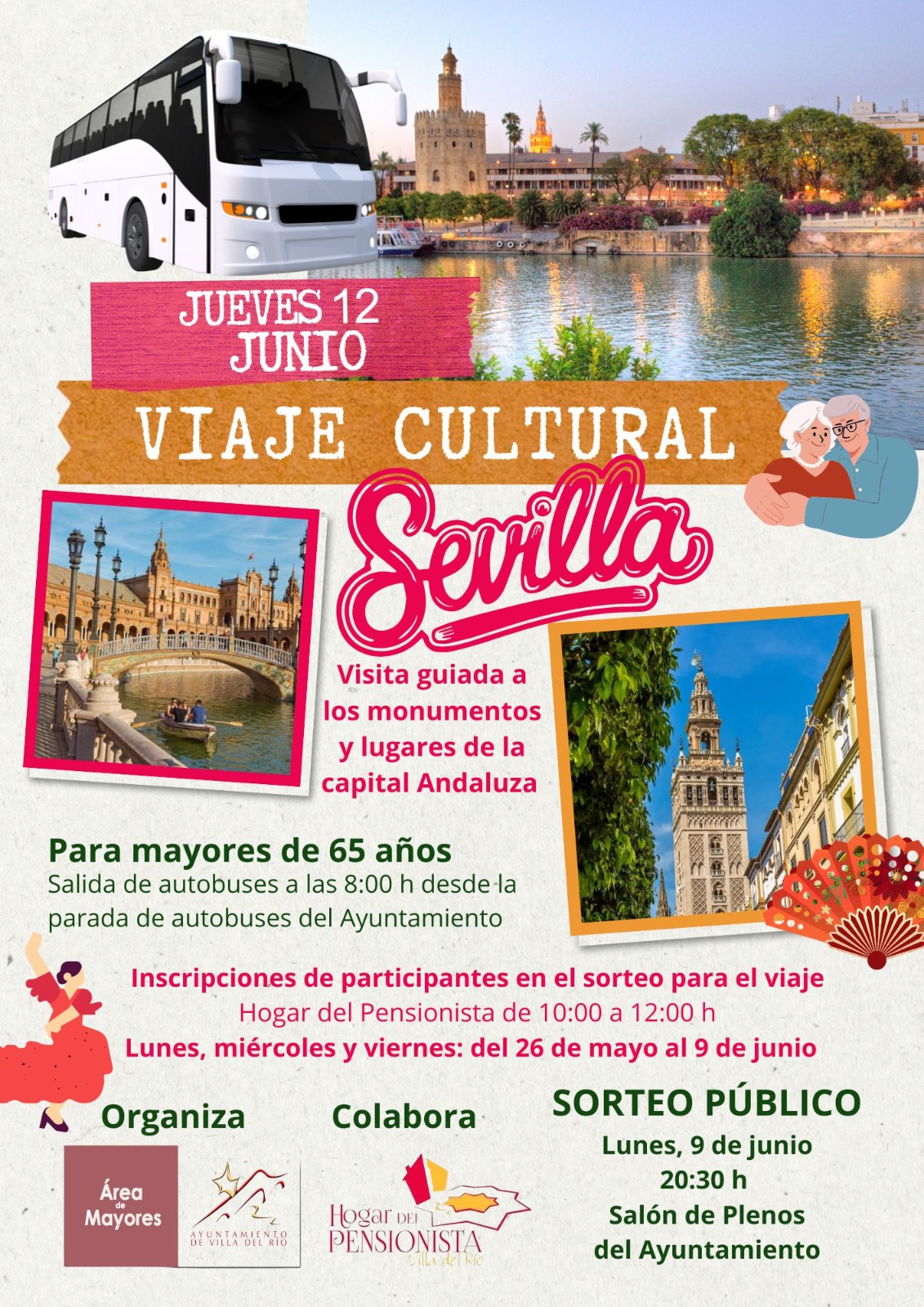 El área de Mayores del Ayuntamiento de Villa del Río organiza, en colaboración con el Hogar del Pensionista, un viaje cultural a SEVILLA, con visita guiada a los monumentos y lugares más emblemáticos de la capital andaluza.